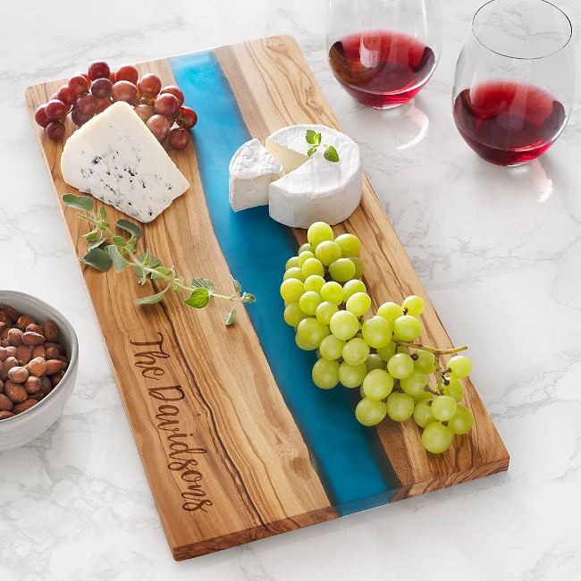 Laser Etched Olivewood Resin Serving Board - Name Design . Made from natural Italian Olivewood with a streak of resin, this striking board features a blaze of color for a truly unique presentation.